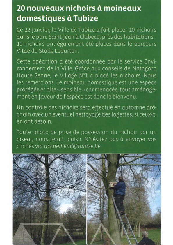 Dans le cadre de la protection de l’environnement, la ville de Tubize a fait appel au service Espaces verts du Village n°1 Entreprises pour placer une dizaine de nichoirs le long du parcours santé.